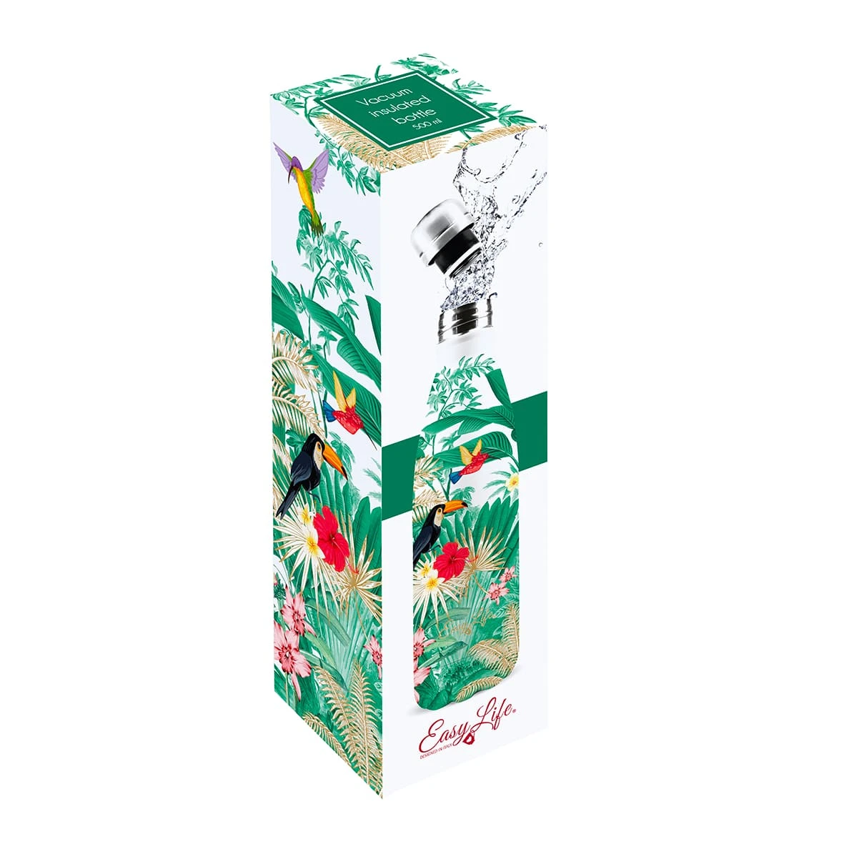 Un vero e proprio paradiso esotico: la graziosa grafica di questa bottiglia termica rappresenta la meravigliosa e super rilassante atmosfera travel.