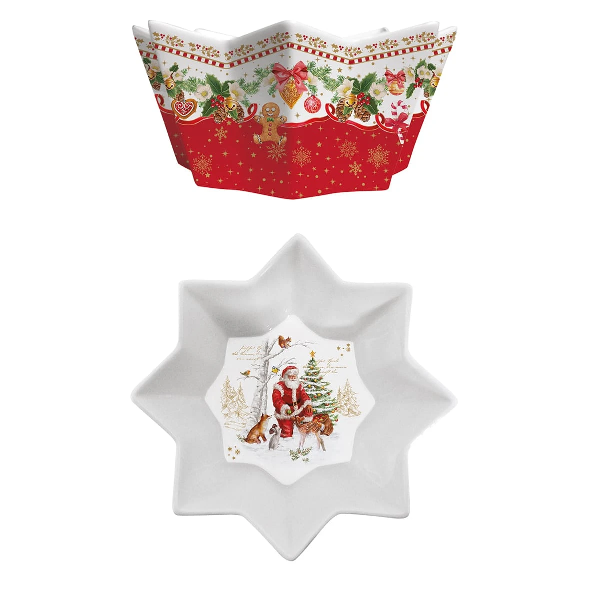 Una ciotola particolare per un momento magico. La forma di stella di Natale e i colori del rosso, verde e bianco, caratterizzano la ciotola in porcellana natalizia della collezione. Stupisci i tuoi ospiti.