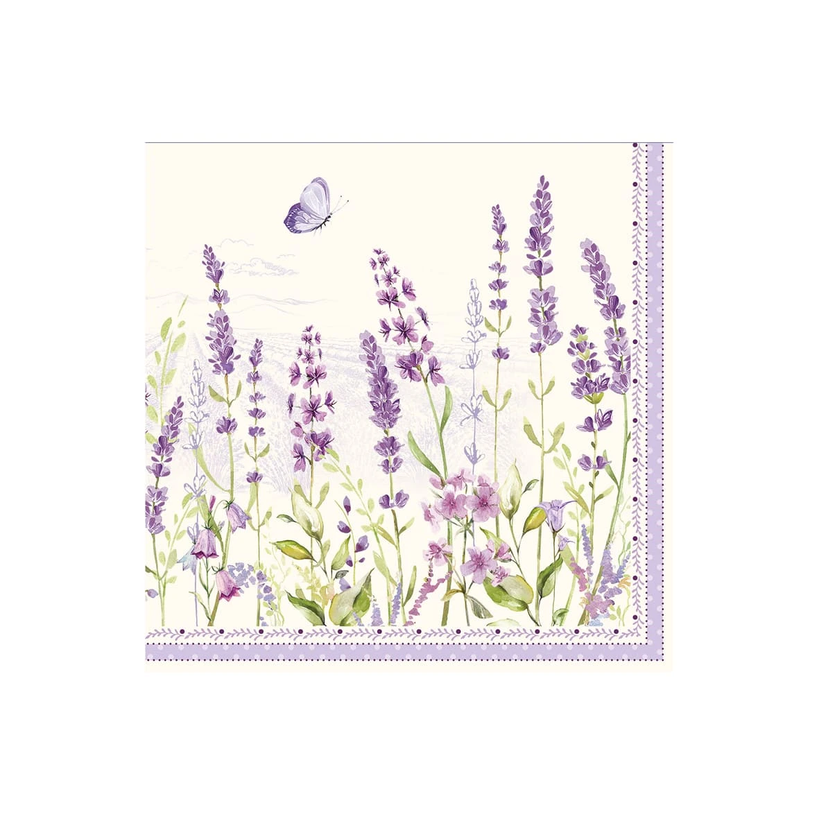 Per completare la mise en place della tua tavola a tema floreale, ecco i tovaglioli di carta della collezione: dettagli colorati che richiamano la bellezza dei campi di lavanda in fiore.