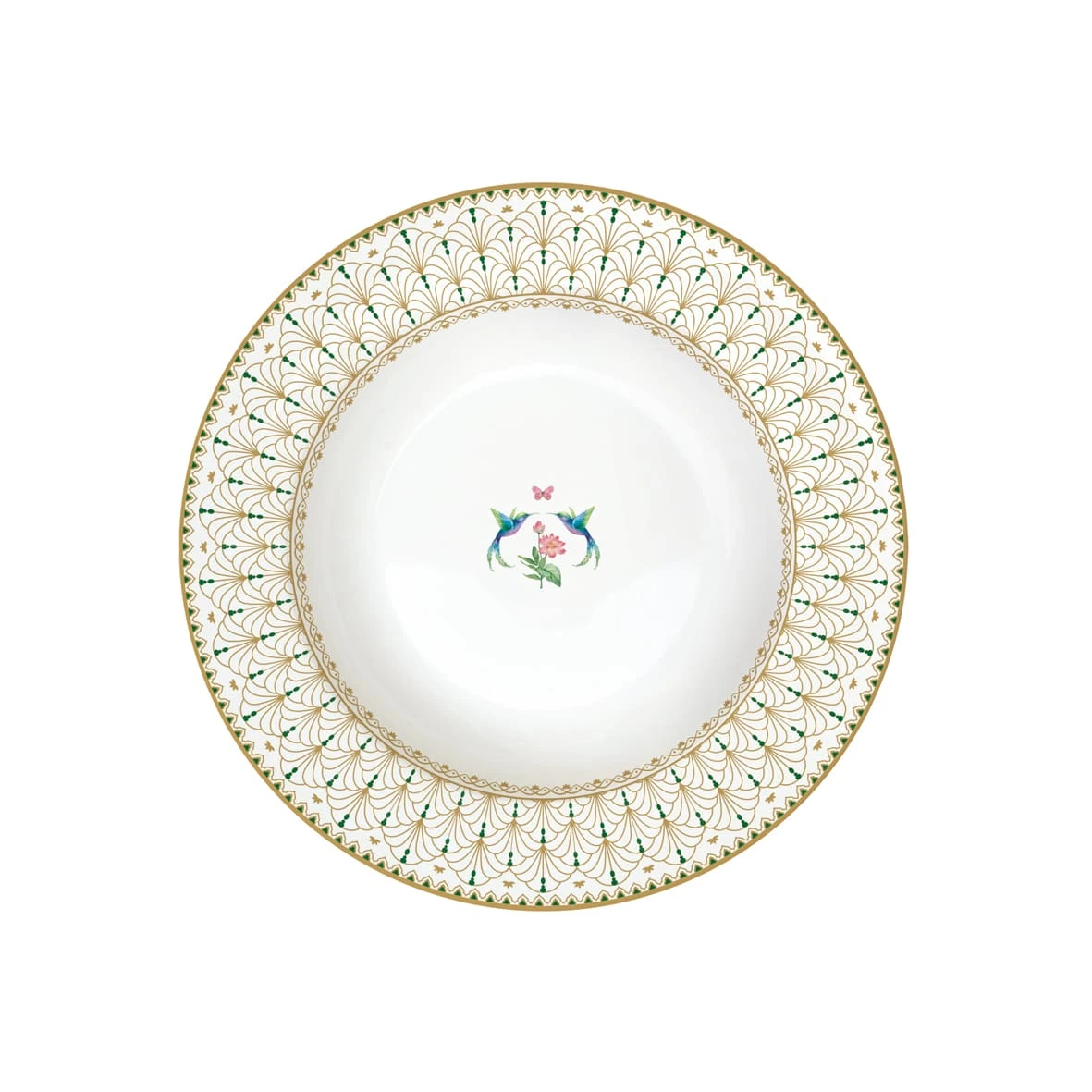 Due eleganti colibrì danzano leggiadri al centro del piatto fondo in porcellana della collezione. Sorprendi i tuoi ospiti con il design esotico che richiama l’India e la sua cultura.