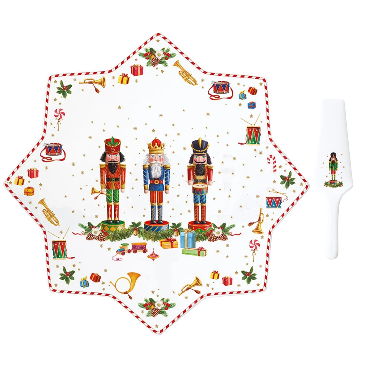 Un bordo impreziosito dalla grafica di colorati oggetti tradizionali esalta le tre figure natalizie del piatto torta di Natale con paletta in porcellana della collezione. Colora e rendi unica la tua tavola con questo piatto a forma di stella di Natale.