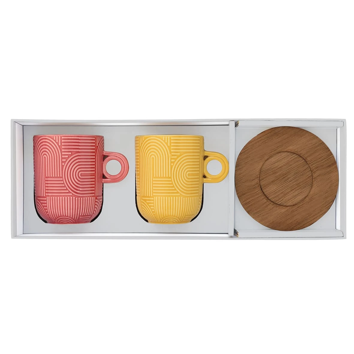 Colora la tua tavola con l’allegria di questo set di 2 tazze in porcellana, ognuna corredata della funzionalità del piattino in acacia. Per una mise en place unica e invidiabile.