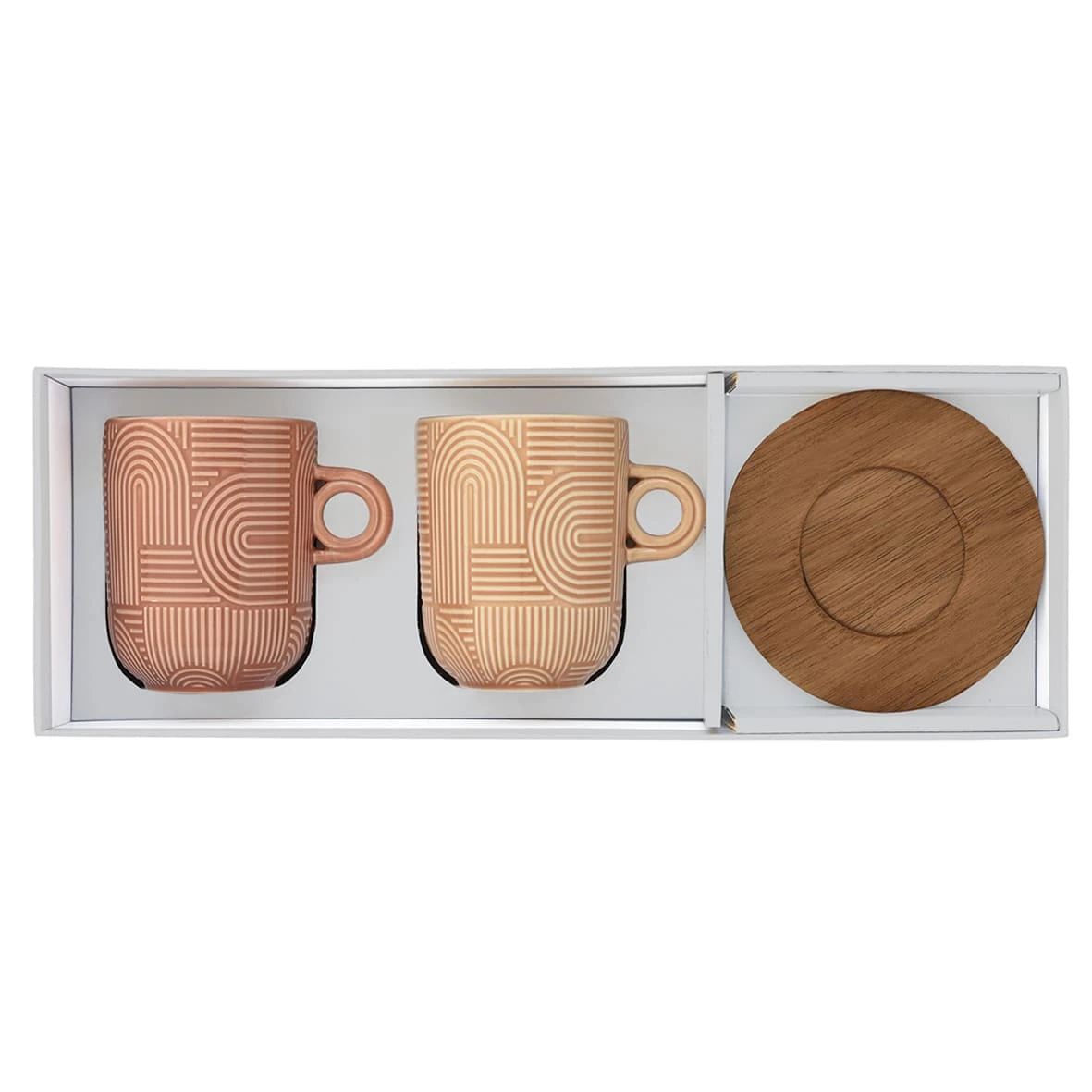 Il set di 2 mug con piattino in acacia della collezione è l’accessorio ideale per conferire alla propria tavola un tocco moderno e raffinato.
