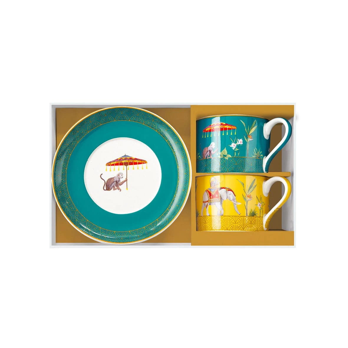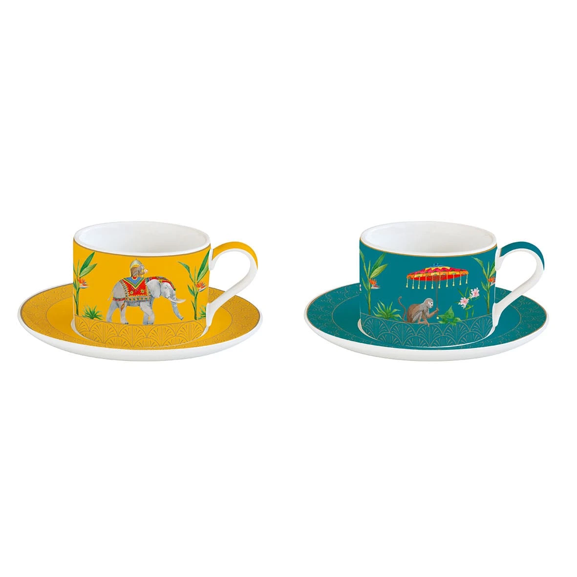 Colori vivaci e grafiche esotiche contraddistinguono questo set di 2 tazze in porcellana con piattino dal design moderno. Un tocco di colore sulla tua tavola per una mise en place esclusiva e originale.