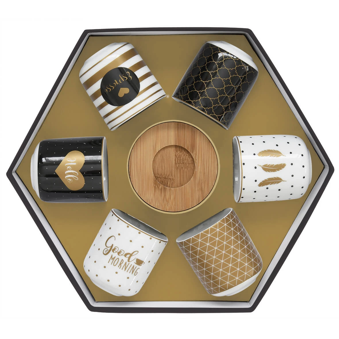 - Elementi: 6 tazzine da caffè con piattino in bamboo e scatola regalo litografata