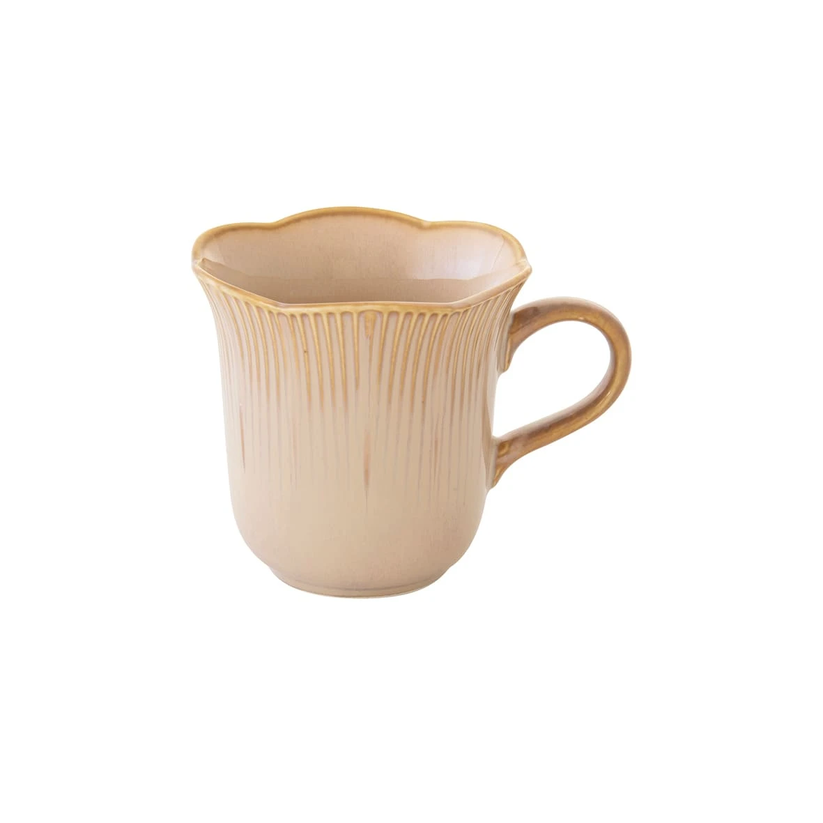 A forma di fiore a campanella e con un design elegante in rilievo la mug beige in porcellana della collezione renderà ancor più piacevole la tua pausa rilassante.