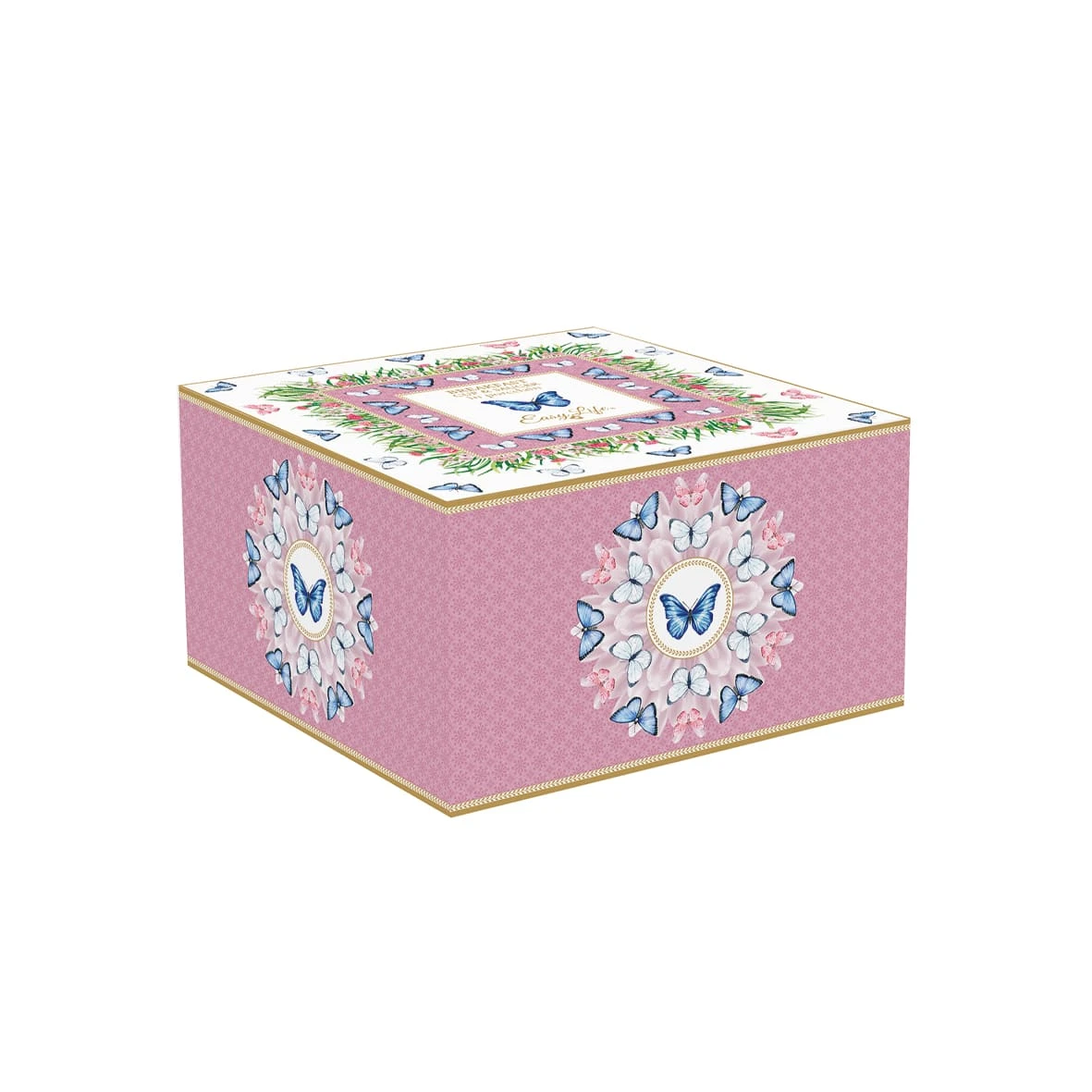 Motivi floreali e tante farfalle blu e rosa creano un design primaverile caratterizzato da colori vivaci capaci di ricreare la stessa armonia che contraddistingue la primavera.