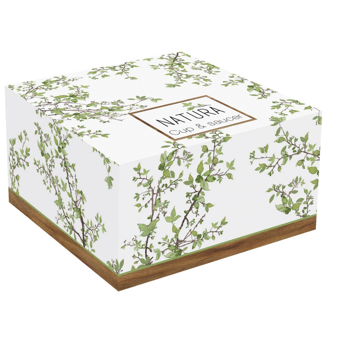 Tazza da the 250 ml in porcellana con piattino in acacia in scatola regalo NATURA