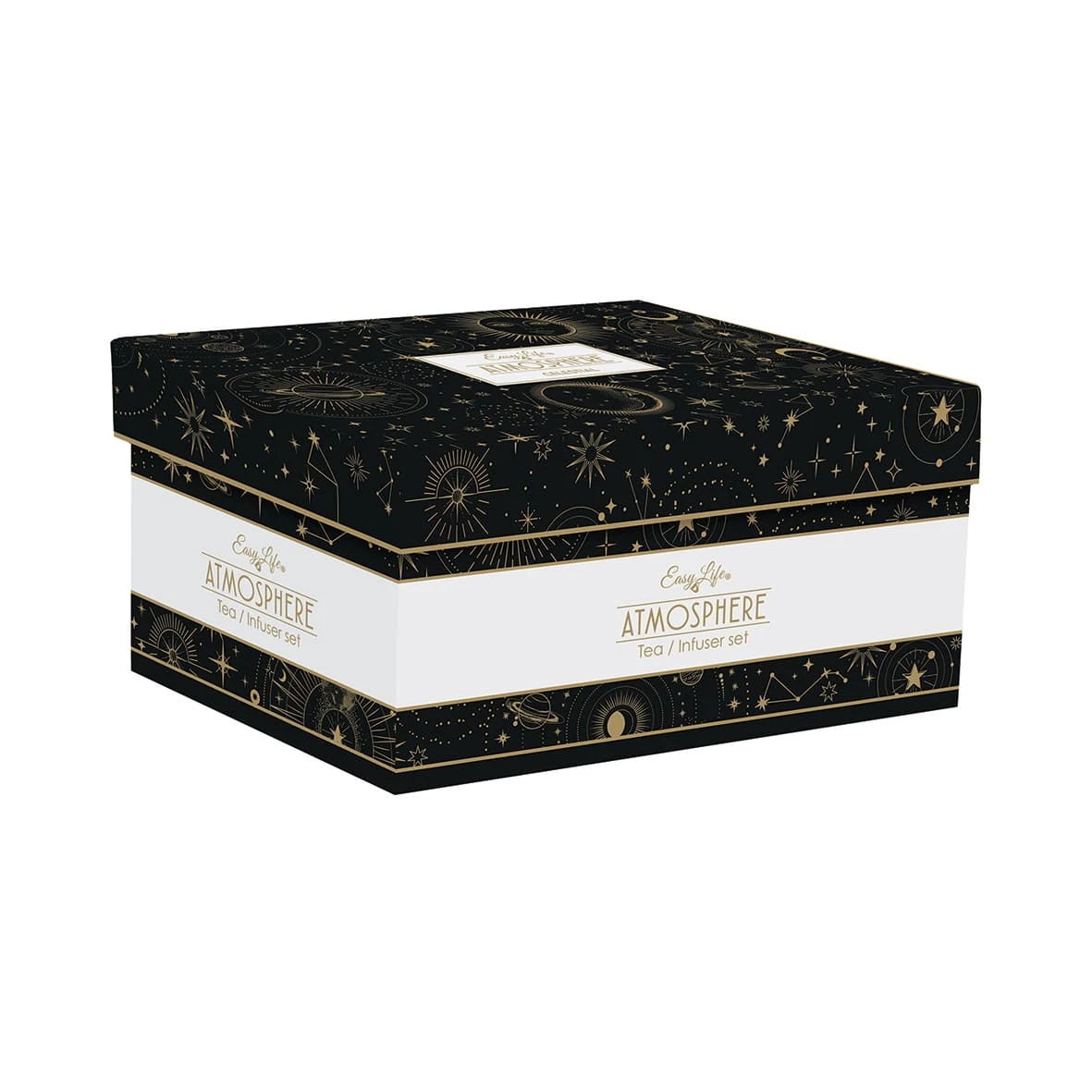 Per una pausa in totale relax, per una merenda o a colazione, la teiera in porcellana della collezione, con infusiera in metallo e due bicchierini in porcellana, è lo strumento perfetto per servire con stile un buon tè caldo. Il design rappresenta il fascino della contrapposizione tra il nero della notte e la luminosità della volta celeste.